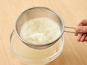 ダイコンをすりおろし、ザルに上げて上から押さえず、自然に汁を落として汁気を切る。魚肉ソーセージはみじん切りに、青ネギは小口切りにする。