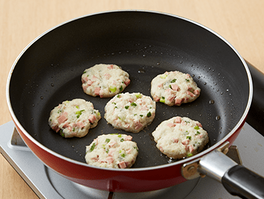 ボウルに(1)と〈A〉を混ぜ合わせ、ごま油をひいたフライパンにひとつ6~7cm大の円盤型になるように置いて、中火で両面を2~3分ずつ焼く。