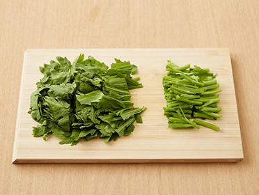 シュンギクは4cm長さに切り、葉と茎の部分に大まかに分ける。ニンジンは細切りに、ニンニクは薄切りに、油あげは一口大に切る。