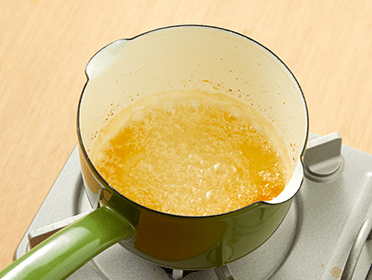 小鍋に砂糖・水を入れて中火にかけ、一部分が茶色になってきたらすぐに火を止める。