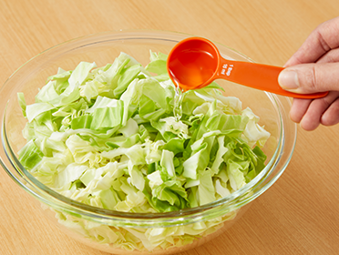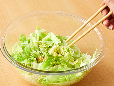 キャベツが熱いうちに鶏ガラスープの素・ごま油を和え、いりごまをかけます。
