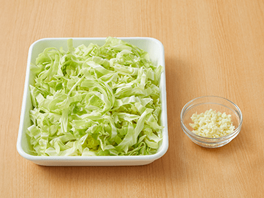 キャベツは1cm幅の細切りにし、ニンニクはみじん切りにする。