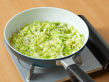 フライパンにオリーブオイル・ニンニク・輪切りトウガラシを入れて、香りが立つまで弱火にかける。中火にして釜揚げしらす・キャベツを加えてフタをして蒸し焼きにし、キャベツが色鮮やかになったら一旦火を止める。