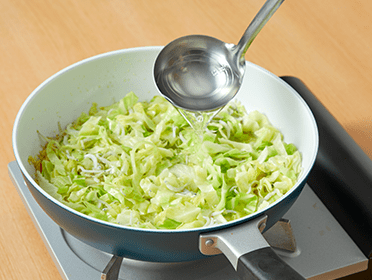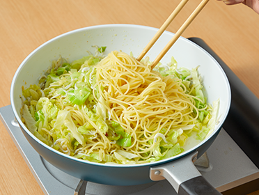 麺を湯切りして具材と絡め、最後に味をみながらうすくち醤油(分量外)で味を調える。
