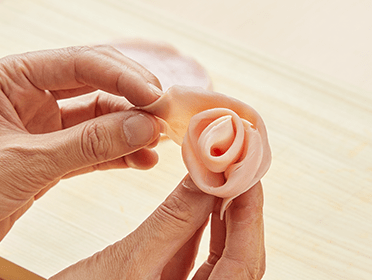 スライスハムや生ハムは縁を外側に曲げて、バラの花のように巻き、プチトマト・キュウリ、赤タマネギ・スプラウトとブーケ風に盛り付ける。