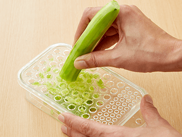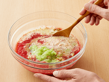 セロリ・タマネギをすりおろして小鍋に入れ〈A〉を加えて中火で3~4分炒め、ボウルに移して冷ます。