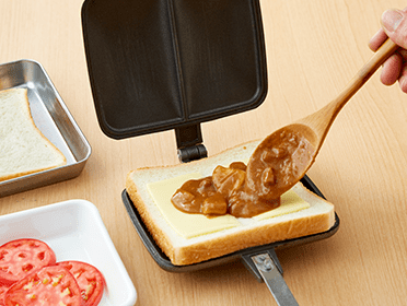 ホットサンドメーカーに食パンをのせ、チーズ・残りのカレールー・トマト・もう一枚の食パンを重ねてのせてセットする。