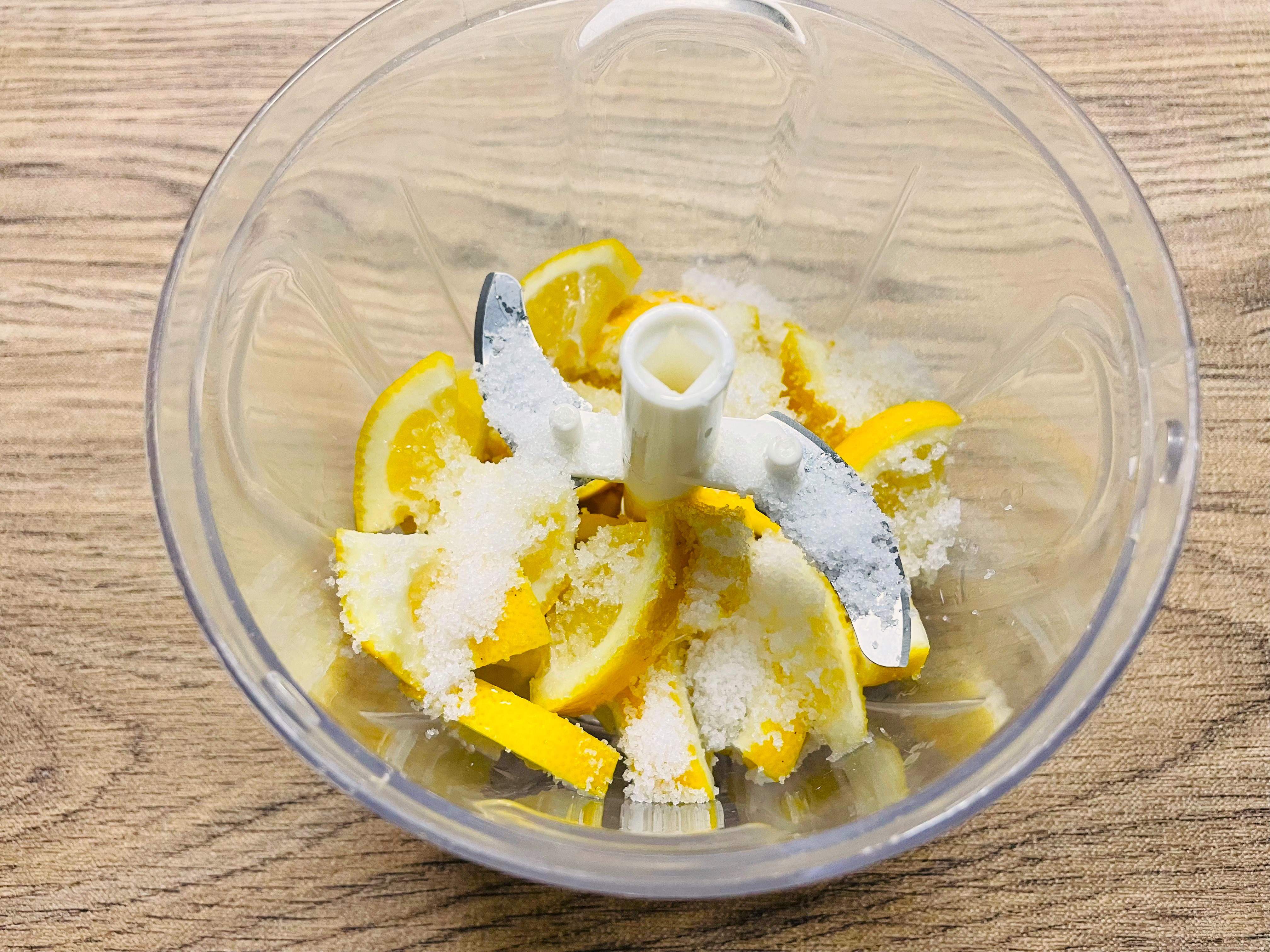 刻んだレモンと塩を入れ、2~3㎜角になるまでフードプロセッサーにかけます。