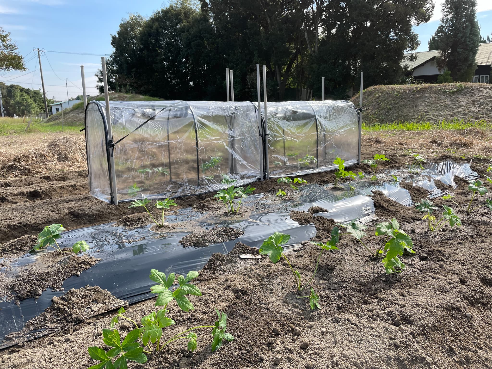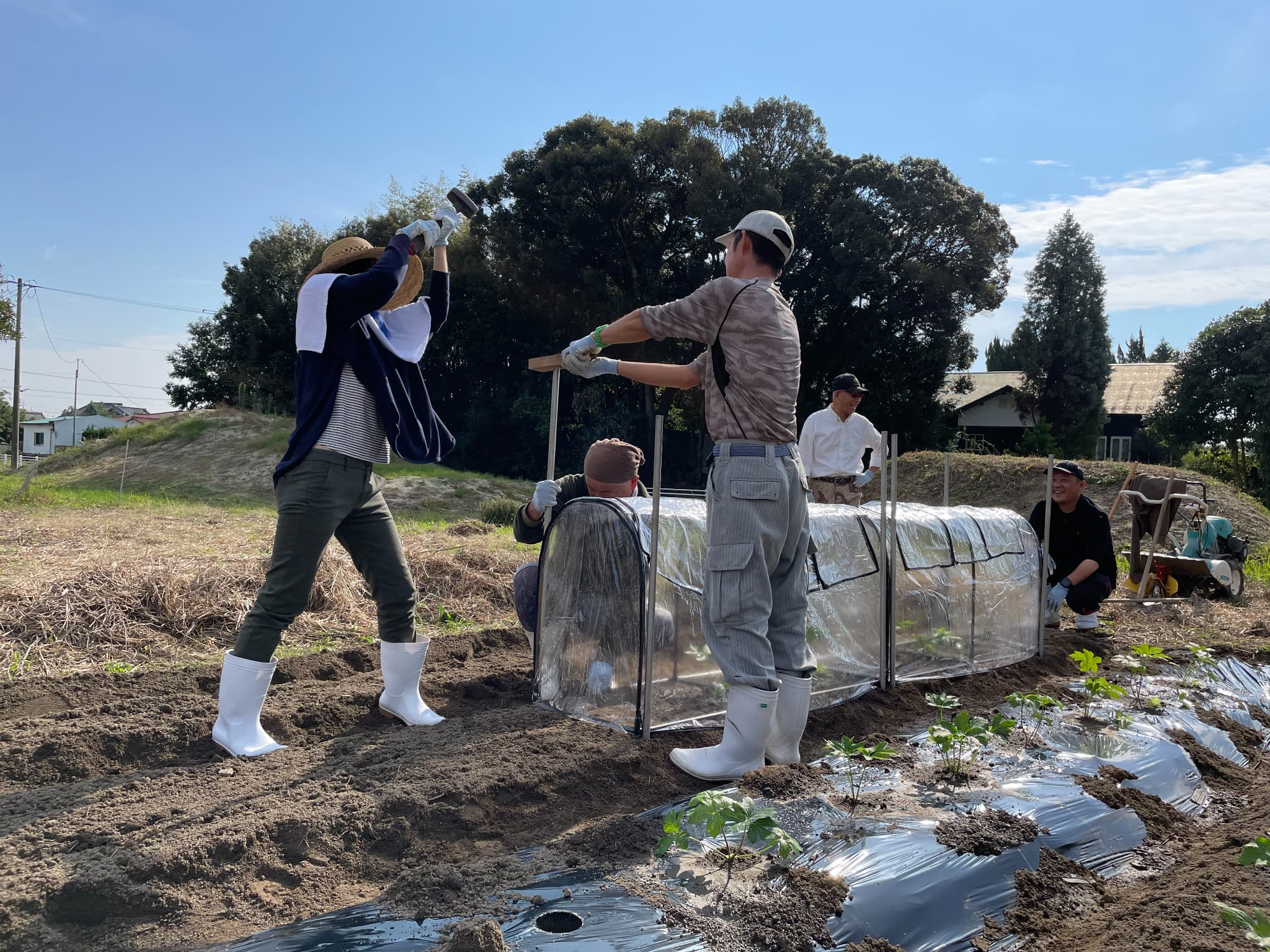 佐賀で明日葉を栽培する人はあまりいないらしく方法も手探り…黒のビニールシートを張ったり、ビニールハウスを組み立てたり、いろんな方法で準備をしました。