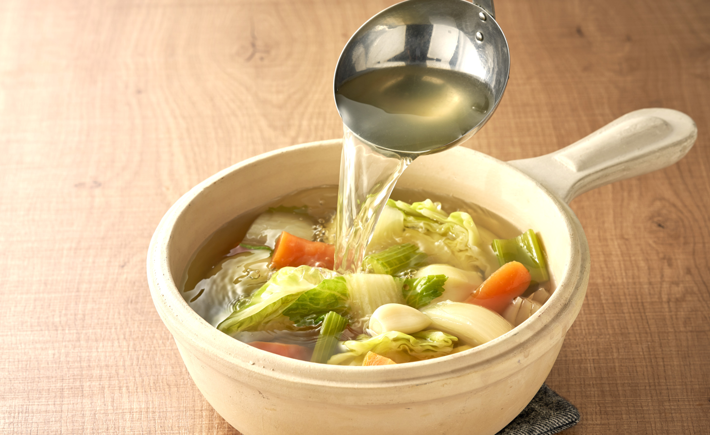 しかしながら、体へのやさしさを取れば手間ひまがかかり、カンタンさを取ればレトルトや冷凍食品で健康から遠ざかり…。そんなモヤモヤを抱えながら過ごしていた10数年前、商品企画を担当していたわたしは「おいしくてヘルシーで、和洋中どんな料理にも合う“だし”を作ろう!」と思い立ち、試行錯誤を重ねること2年。ようやく完成したのが『ていねい通販の野菜だし』でした。
