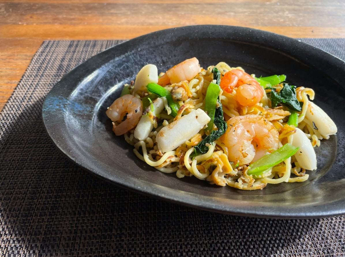 ①フライパンに油を熱し、中華麺を軽く焼き色がつくまで炒める