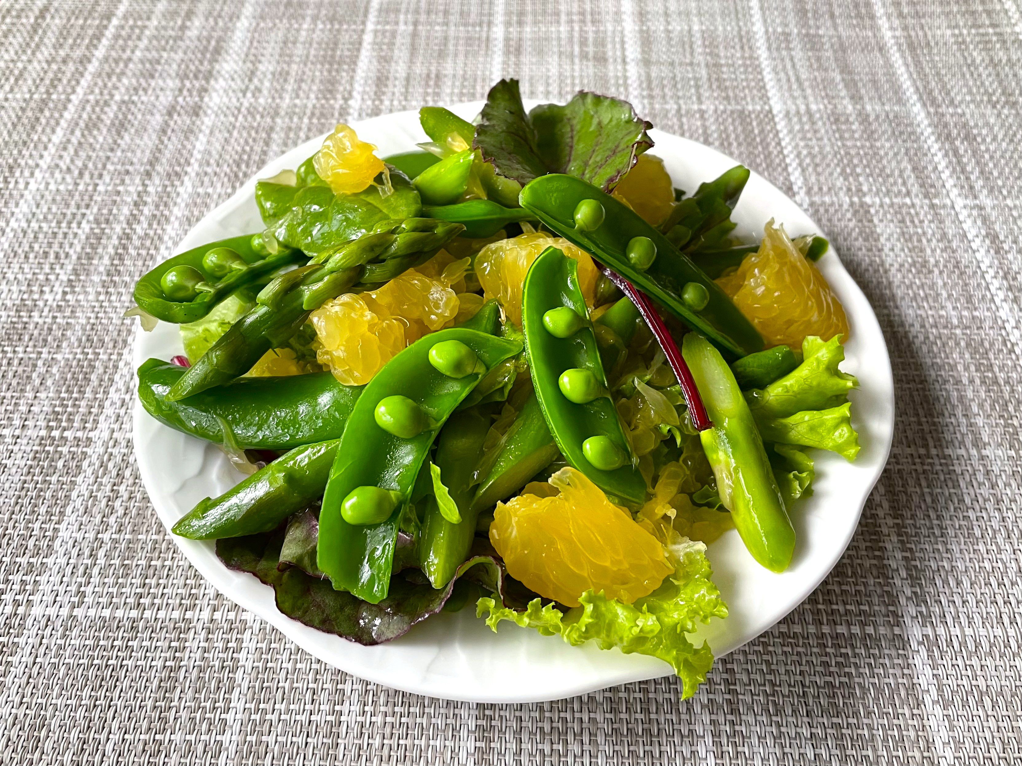 ③ボウルに【A】を入れて混ぜ、❷とスナップえんどう、皮を剥いたはっさく、ベビーリーフを加えて和える