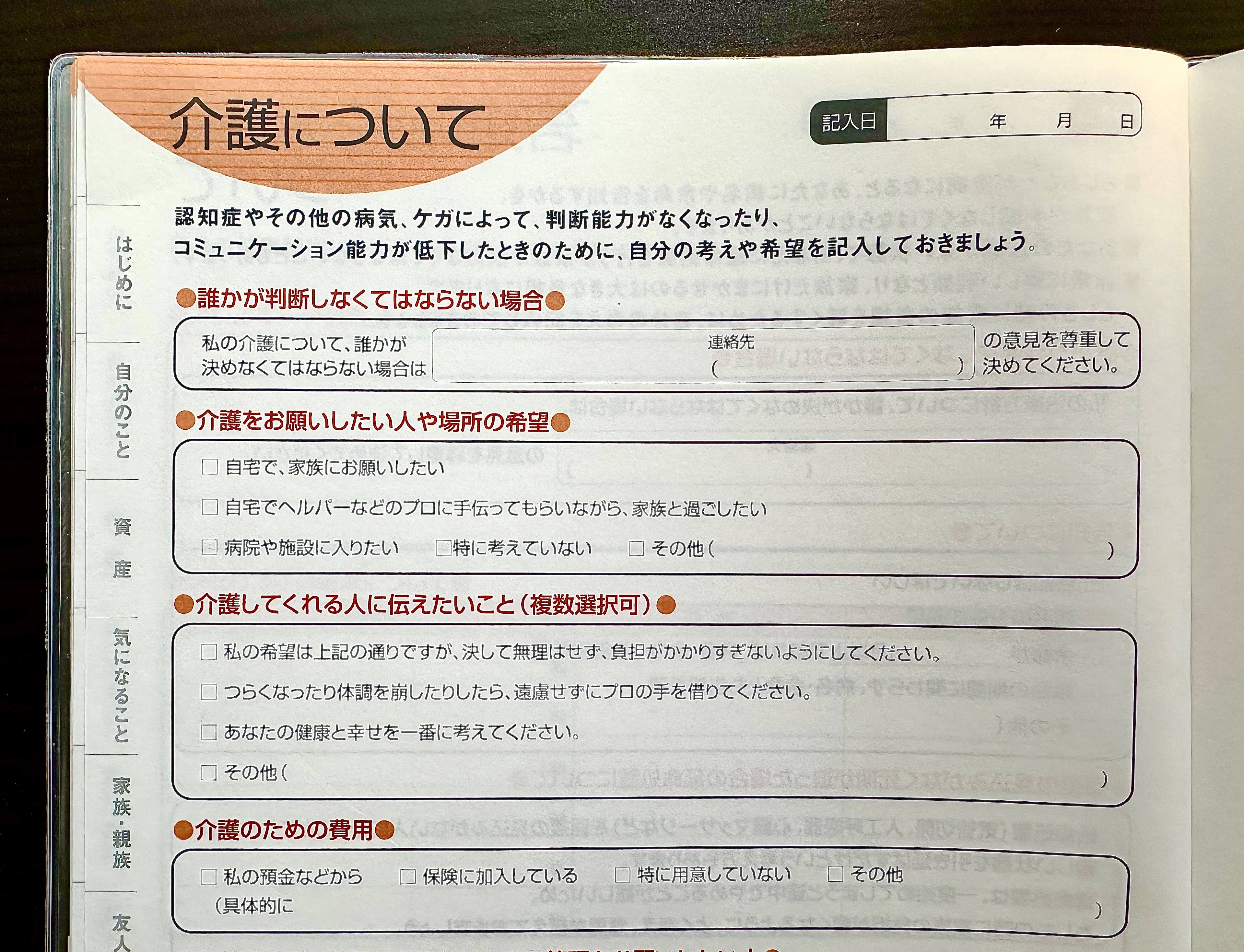 1冊2000円程のノートなのですが、 ページの項目をペラペラ~とめくるだけでも 「確かに!こんなことも書いていたら助かるかも!」と気付きがたくさんあります。