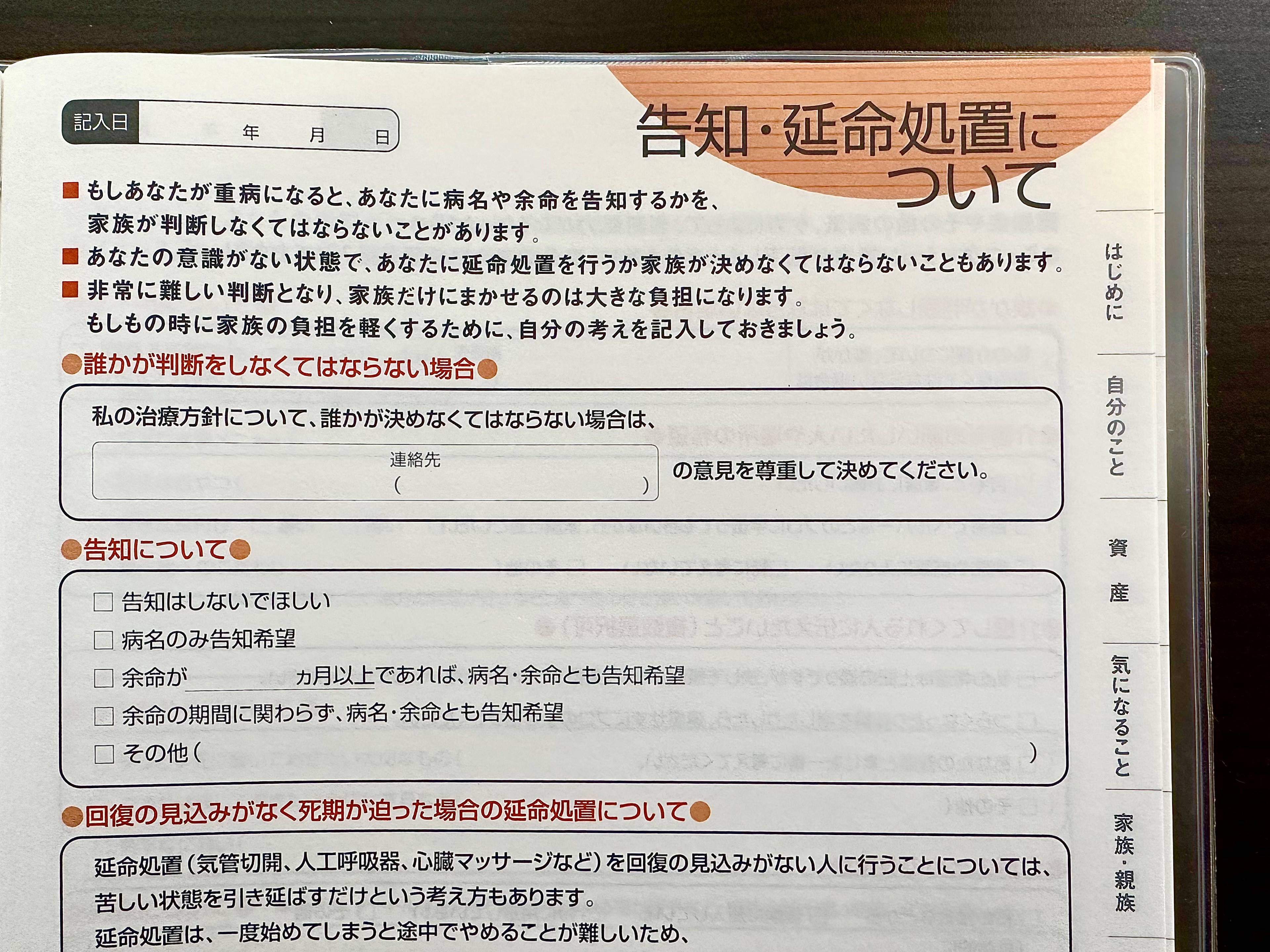 もしもの時の「告知・延命処置」の希望についても自分の意思をちゃんと伝えられるよう書く項目が設けられていて…