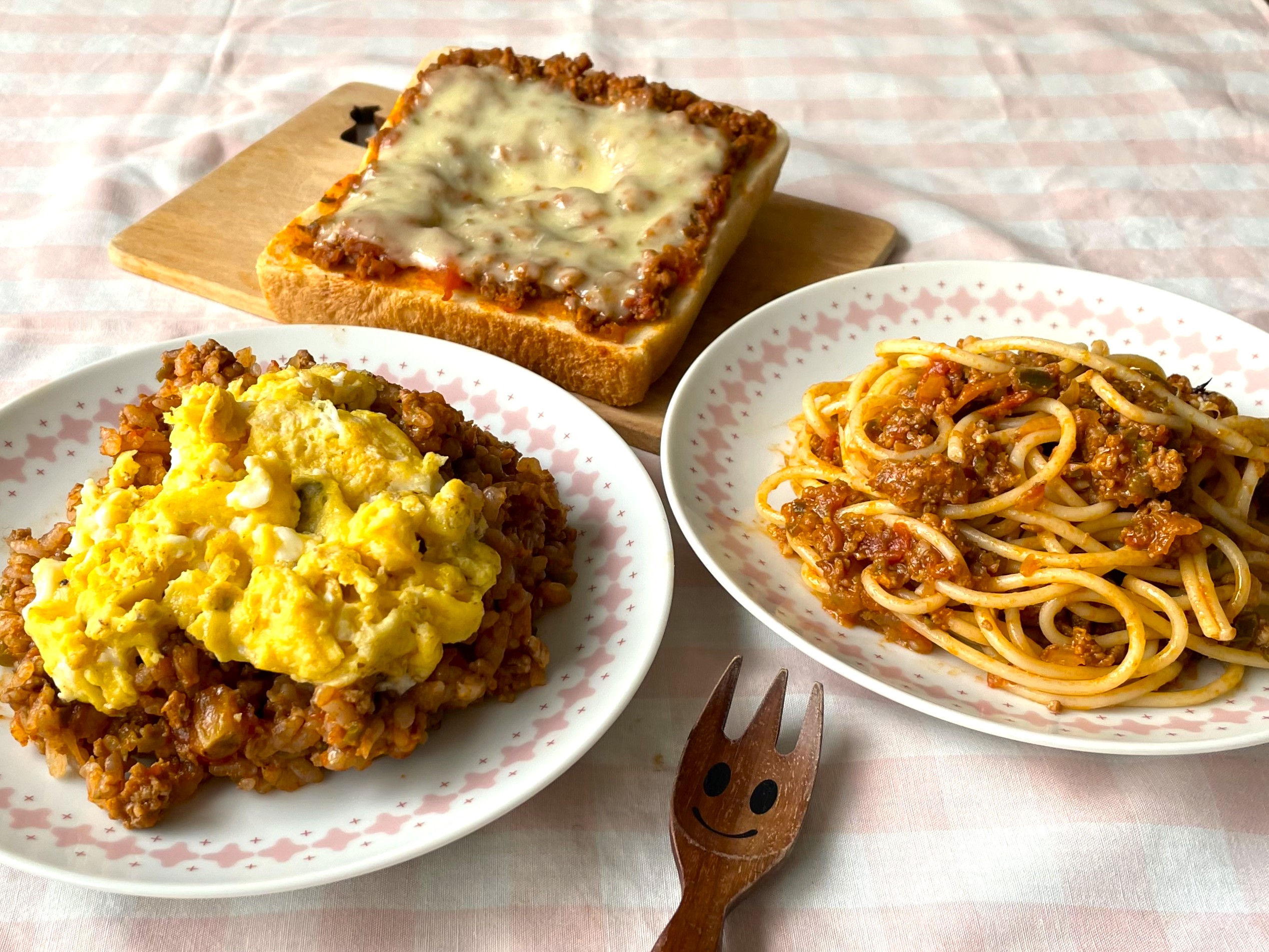 ②鍋に合い挽き肉と❶を入れ、中火で約4分炒める
