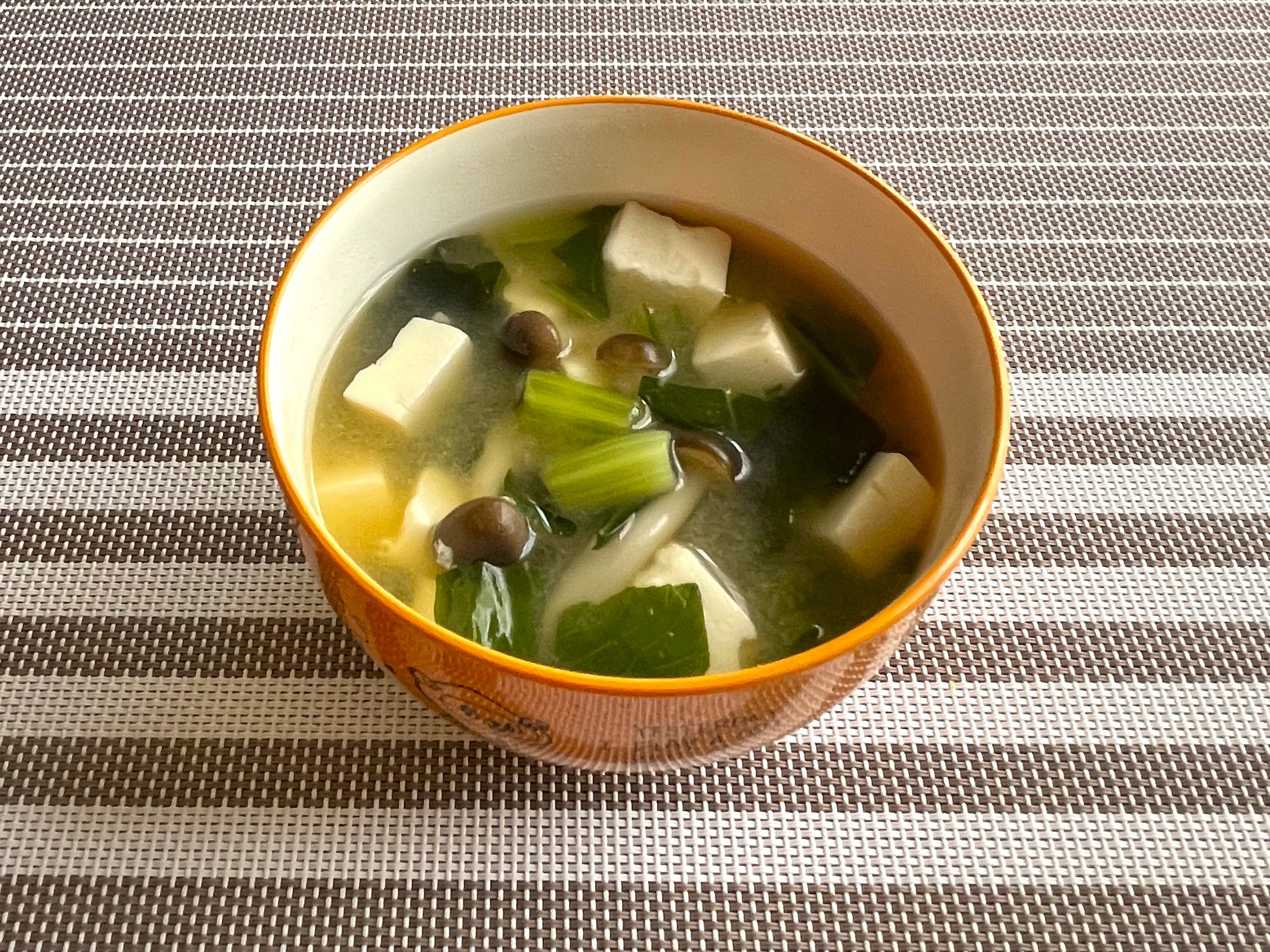 ①小松菜は1~1.5cm幅に、しめじは子房に分ける。豆腐は食べやすい大きさにカットする