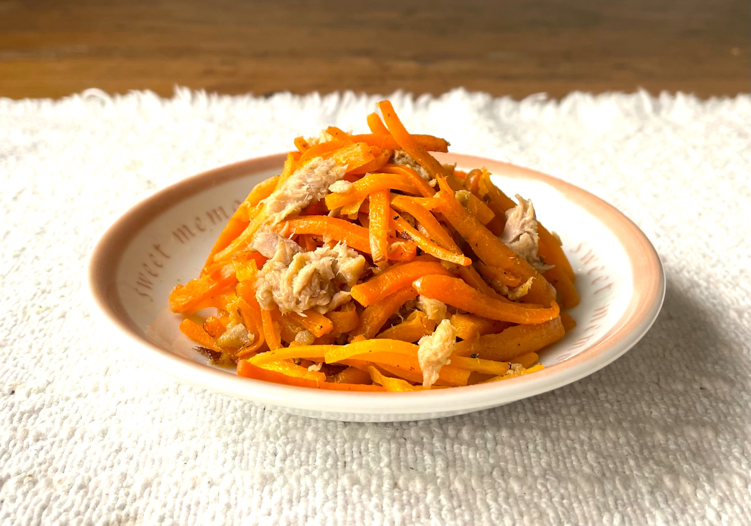 にんじんは皮の下に栄養があるので、皮はむかずにそのまま使用します♩細切りにしてレンジで加熱することで食感を柔らかくし、油で炒めることで香りを抑えます