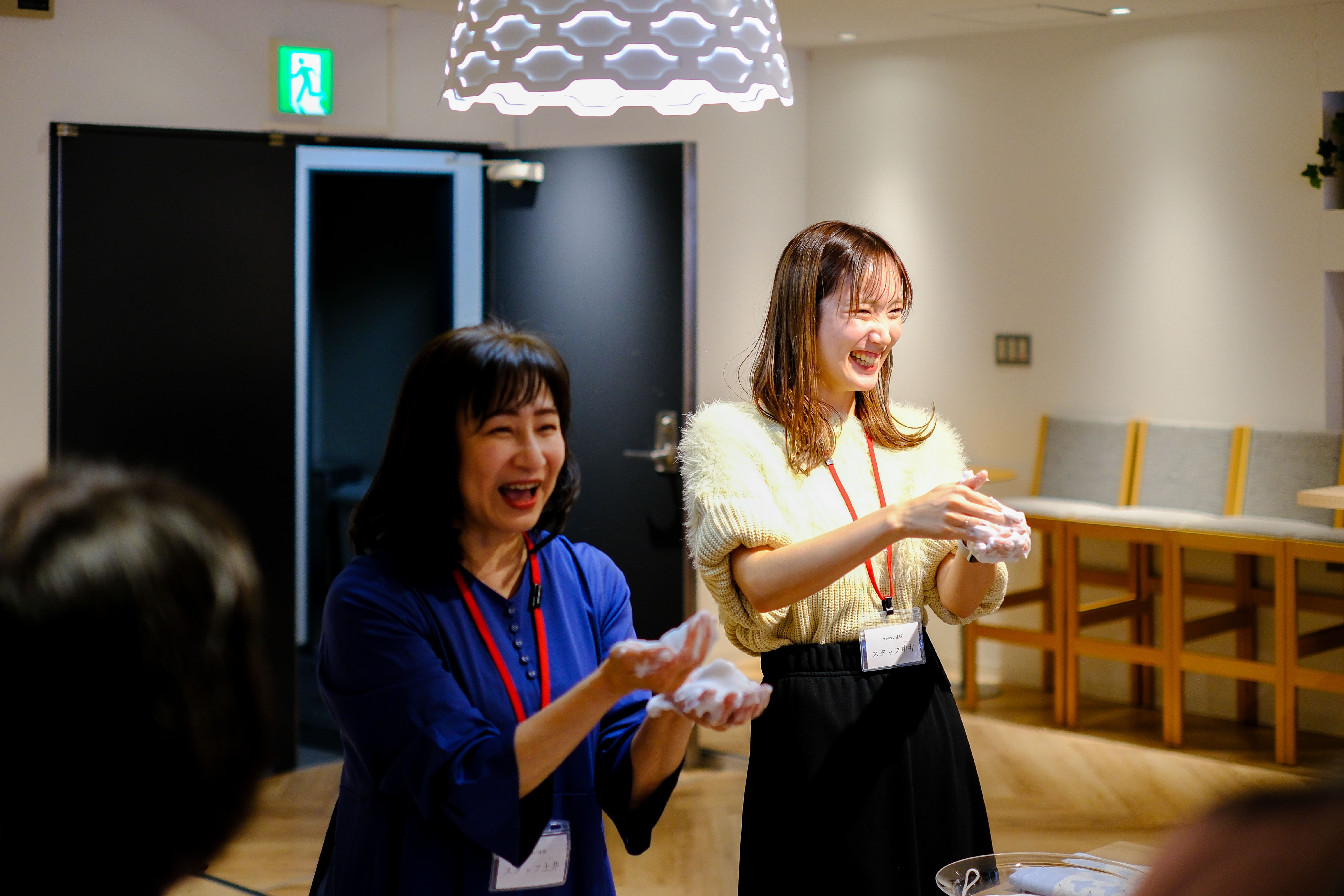 泡立てるポイントは、洗顔フォームの量と、空気の含ませ方。ベテランスタッフと新人スタッフの泡立て具合の違いに、皆さん興味津々の様子でした。