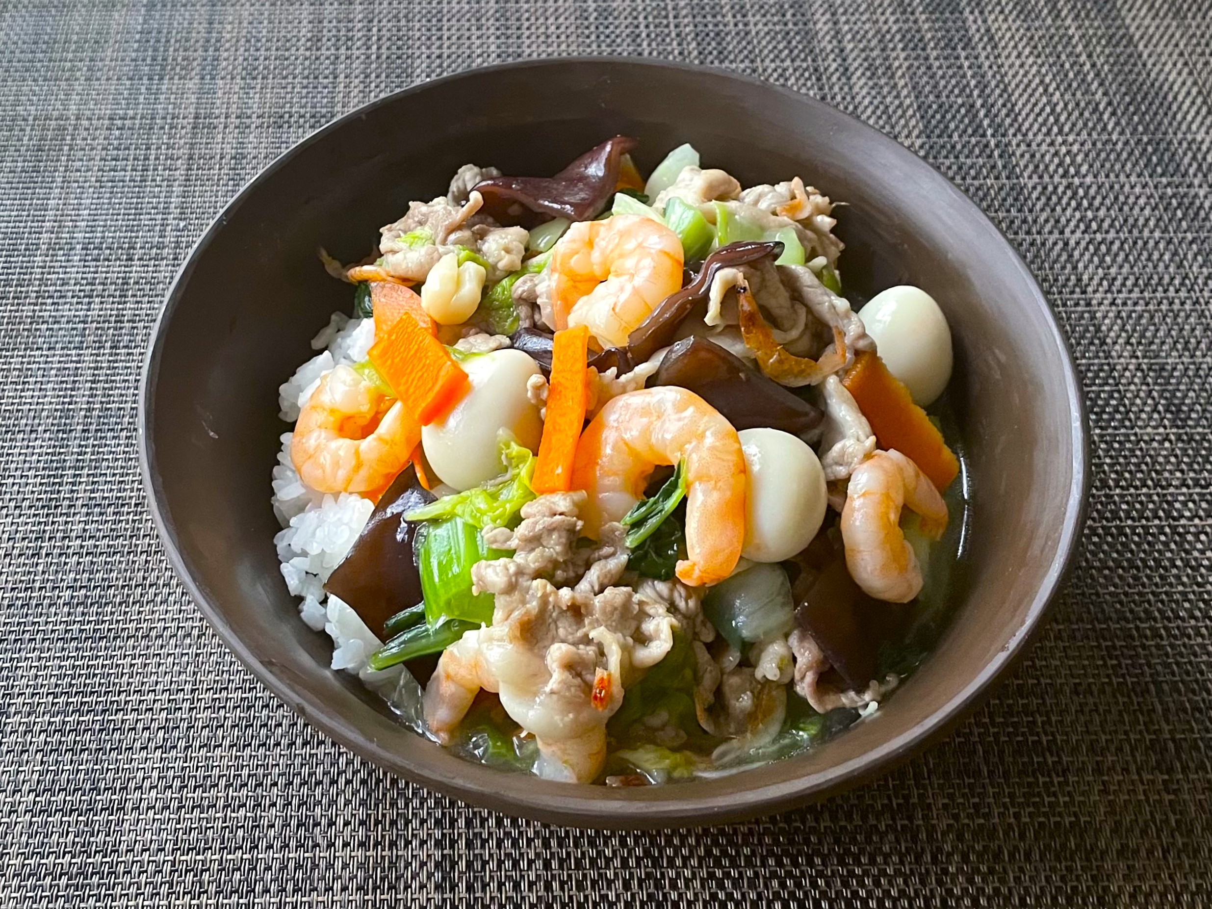 ④とろみがついたら火を止め、器に盛ったごはんの上に➌をかける