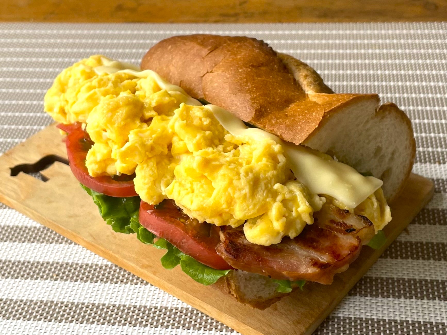 ベーコンを焼いた後でスクランブルエッグを作ることで、ベーコンの脂と香りをプラス☆
