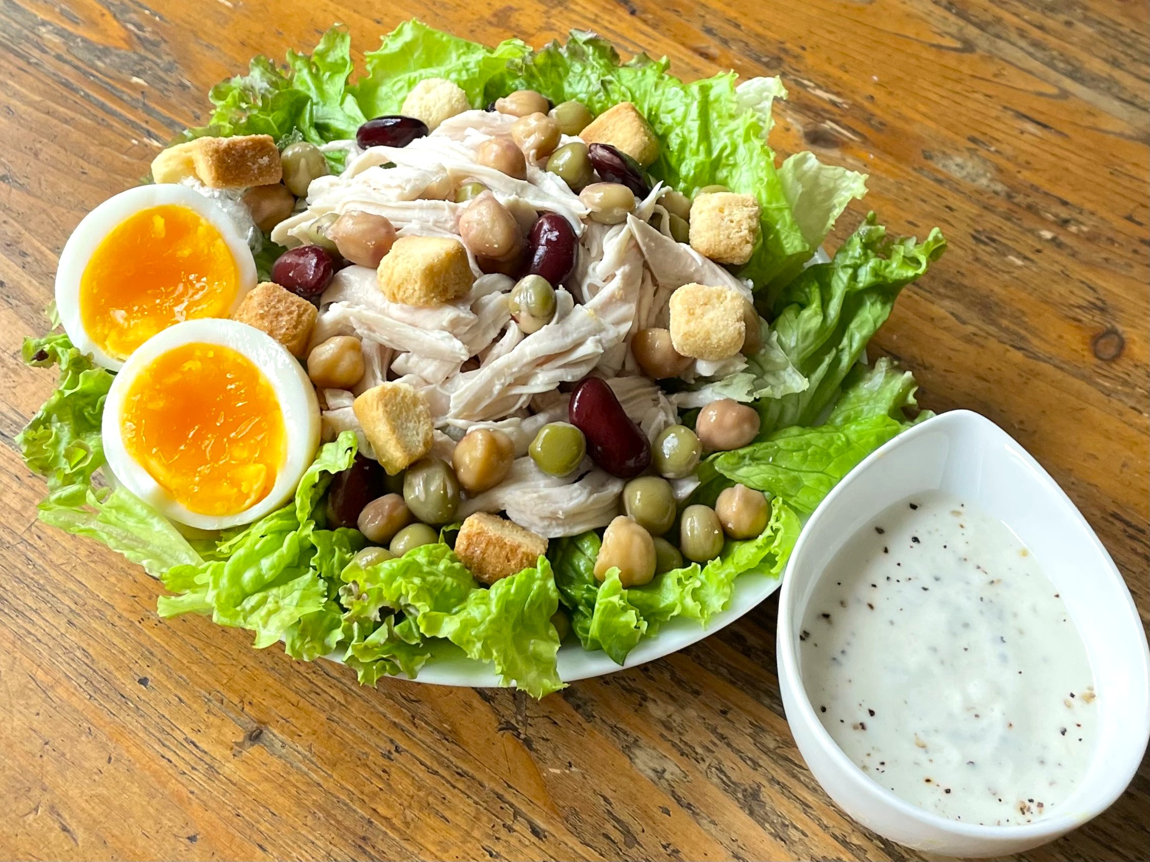 ③器にひと口大にちぎったレタス・❷・ミックスビーンズ・ゆで卵・クルトンをのせる