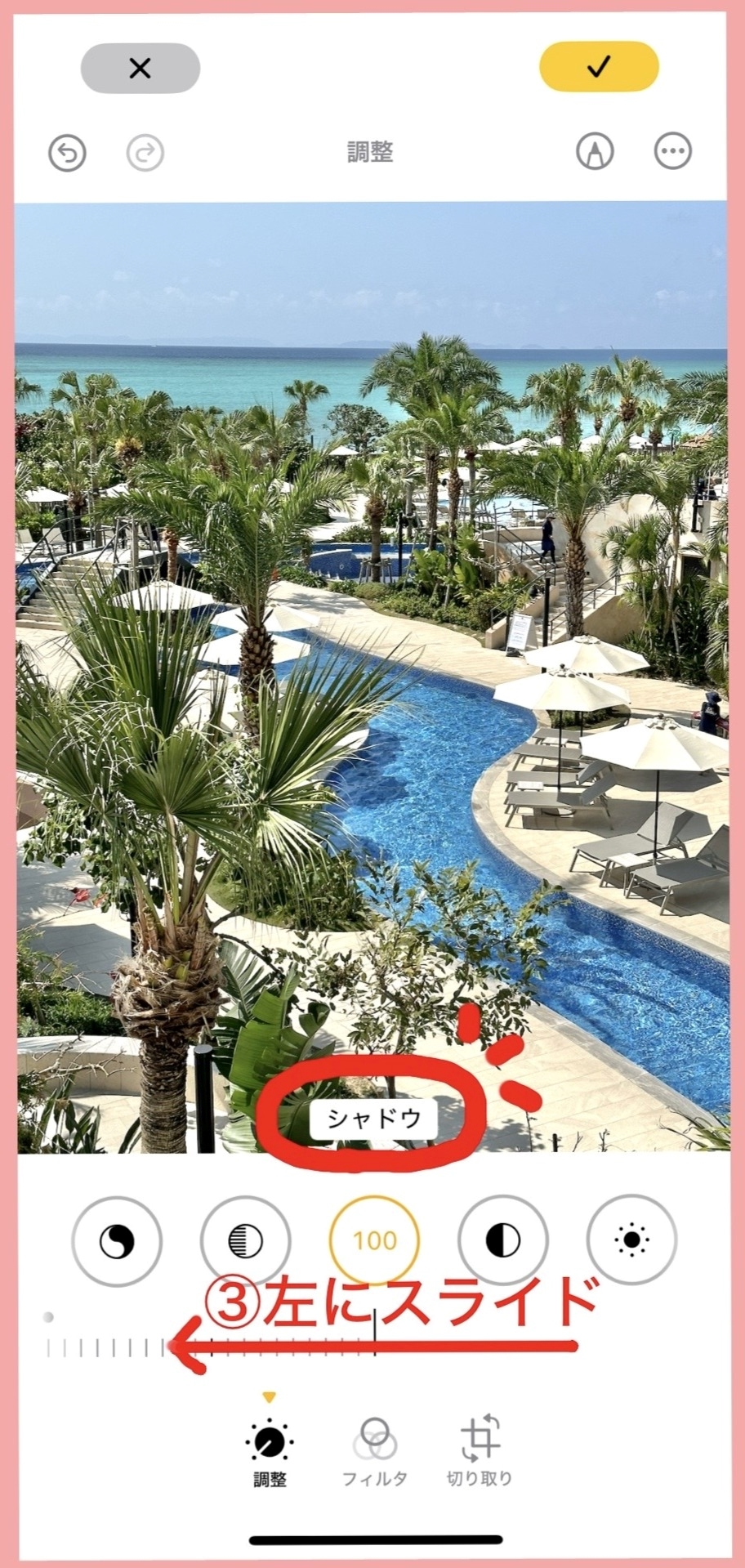 マークの上の文字(赤丸で囲んだ部分)が「シャドウ」という所まで来たら、下のメモリの部分に指を持って行き左方向にスライドすると画像の影が取れて明るくなるので、お好みの明るさに調整します。