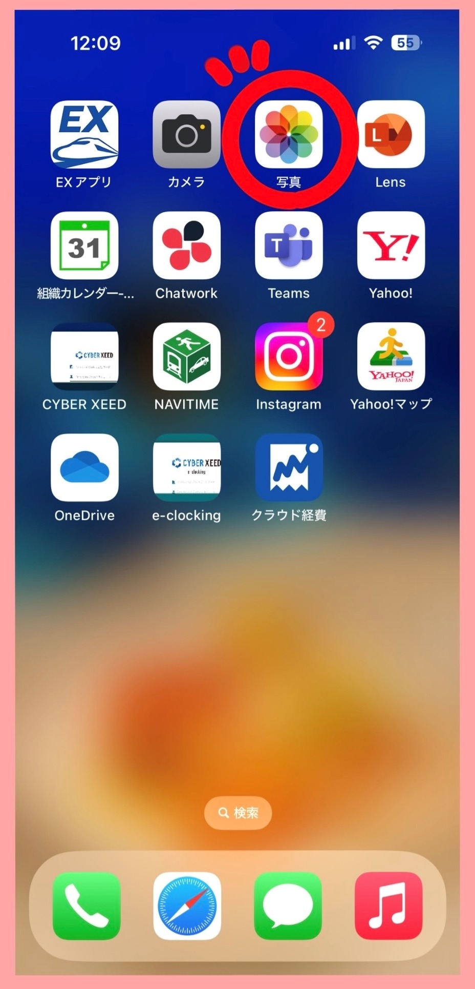 まずはホーム画面の、赤丸で囲んだ部分「写真フォルダ」をタップして、保存された写真の中から一枚をお好きな写真をお選びください。