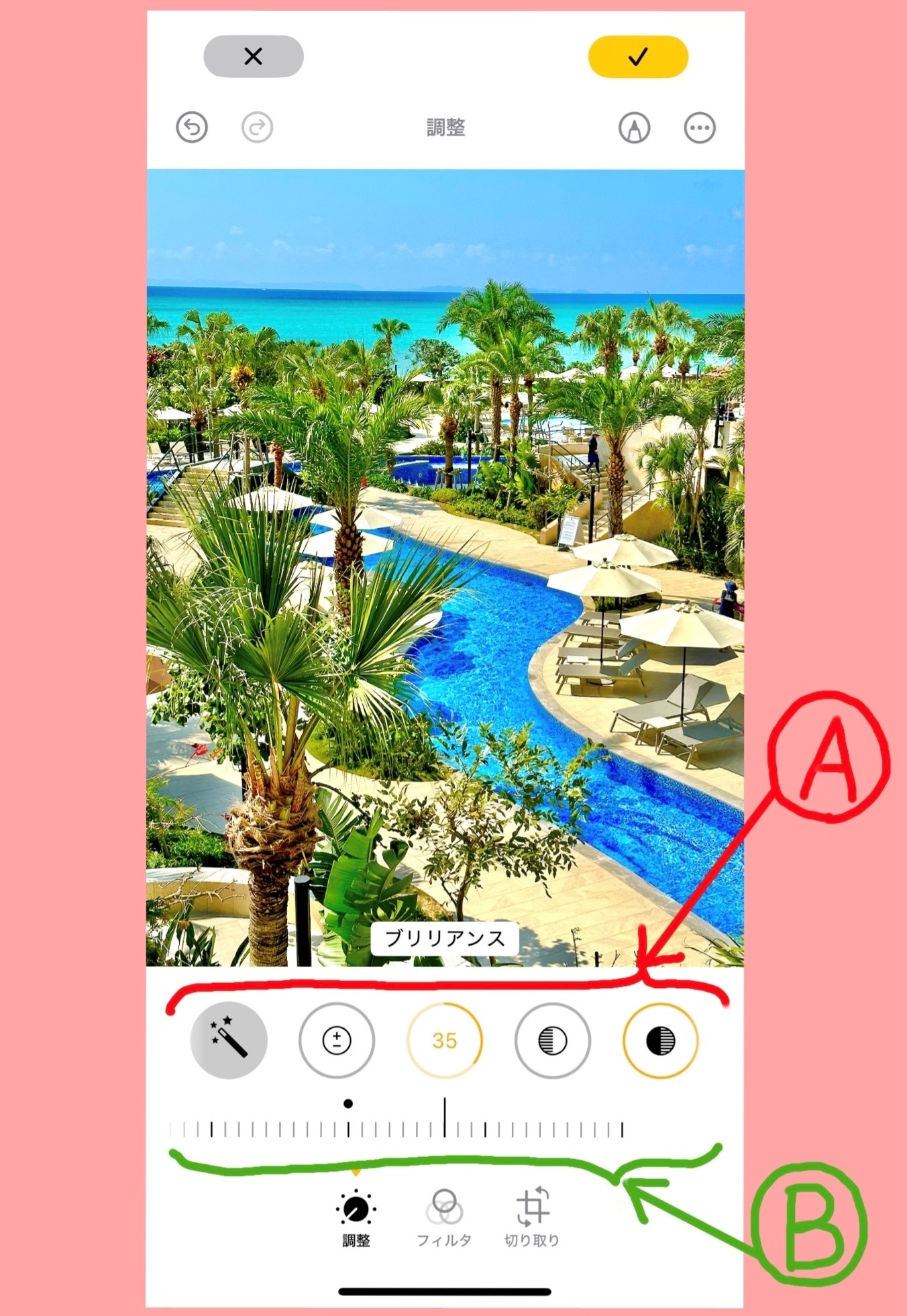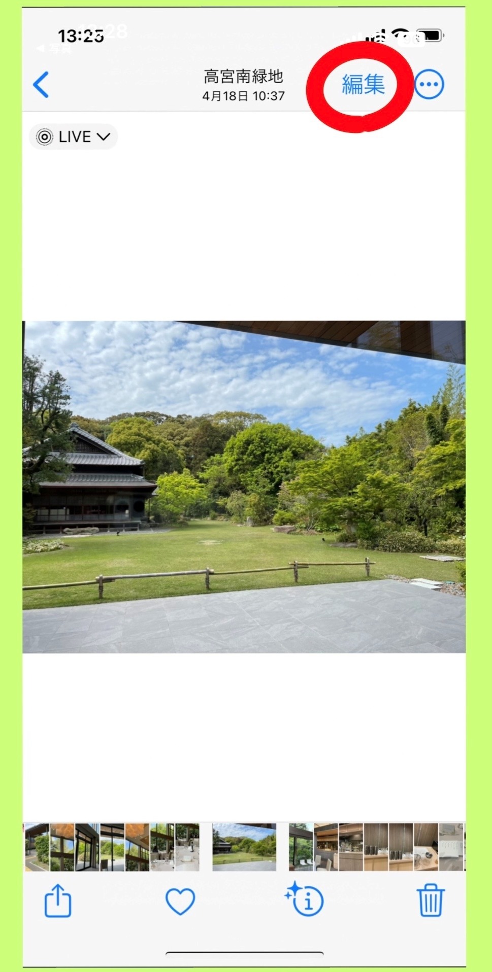 写真の下の赤丸で囲んだ部分をタップして編集スタート!