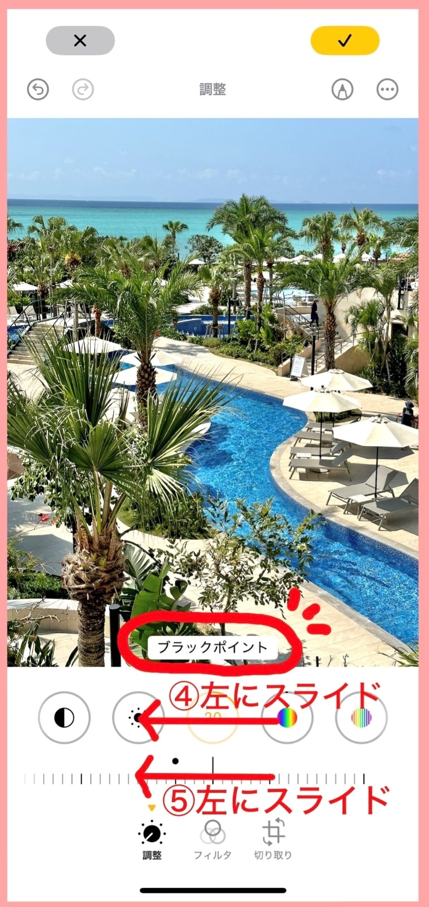 ④の部分に指を持って行き、左にスライドし「ブラックポイント」というところまで来たら、⑤のメモリ部分に指を移し、左にスライドすると陰影ができ画面に立体感が生まれます。