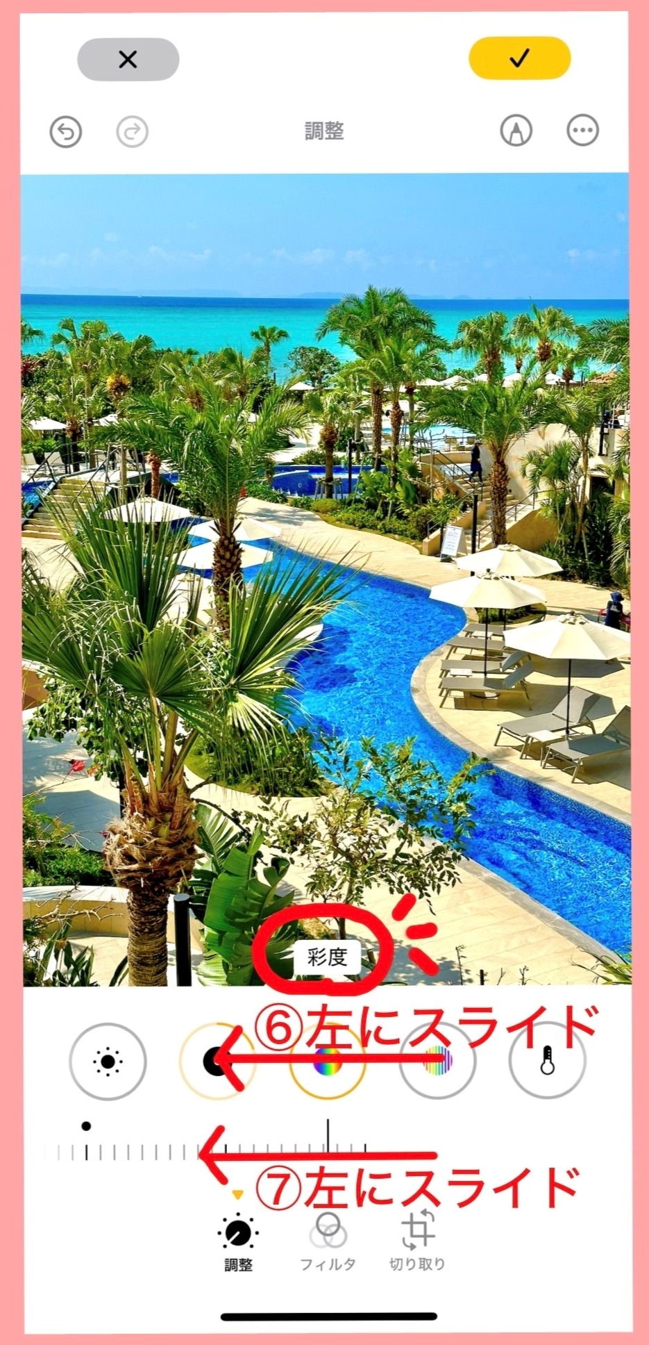 ⑥の部分を左にスライドし「彩度」というところで手を止めたら、⑦のメモリに指を持って行き、左にスライドすると画像が色鮮やかになります。