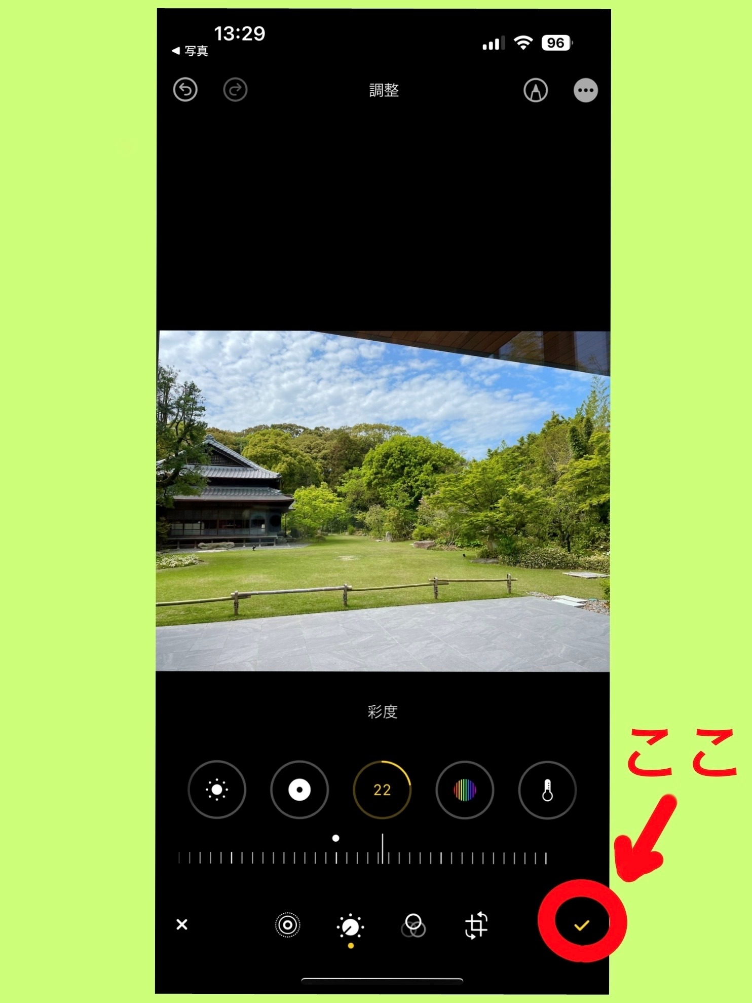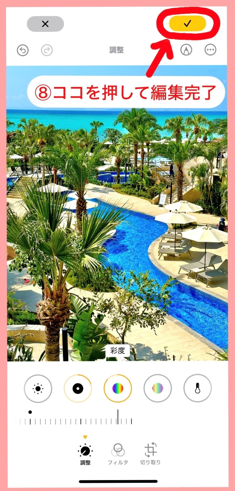 お好みの鮮やかさに調節できたら、右上の黄色いチェックマークをタップして編集完了!