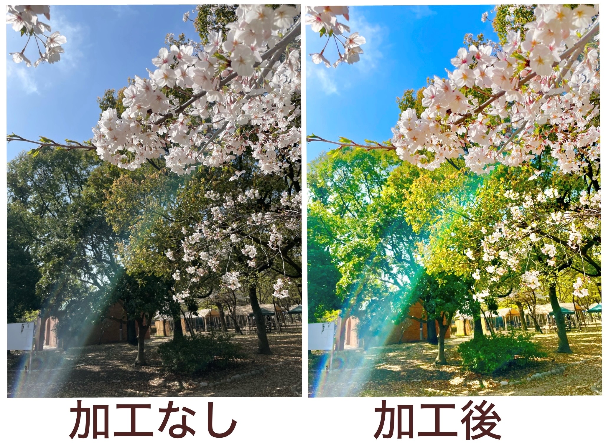 左の「加工なし」の写真は、太陽の日差しが強い昼に撮影したこともあり、どうしても光の当たり具合などで木々の緑や桜の色が少しくすんで写ってしまっています。