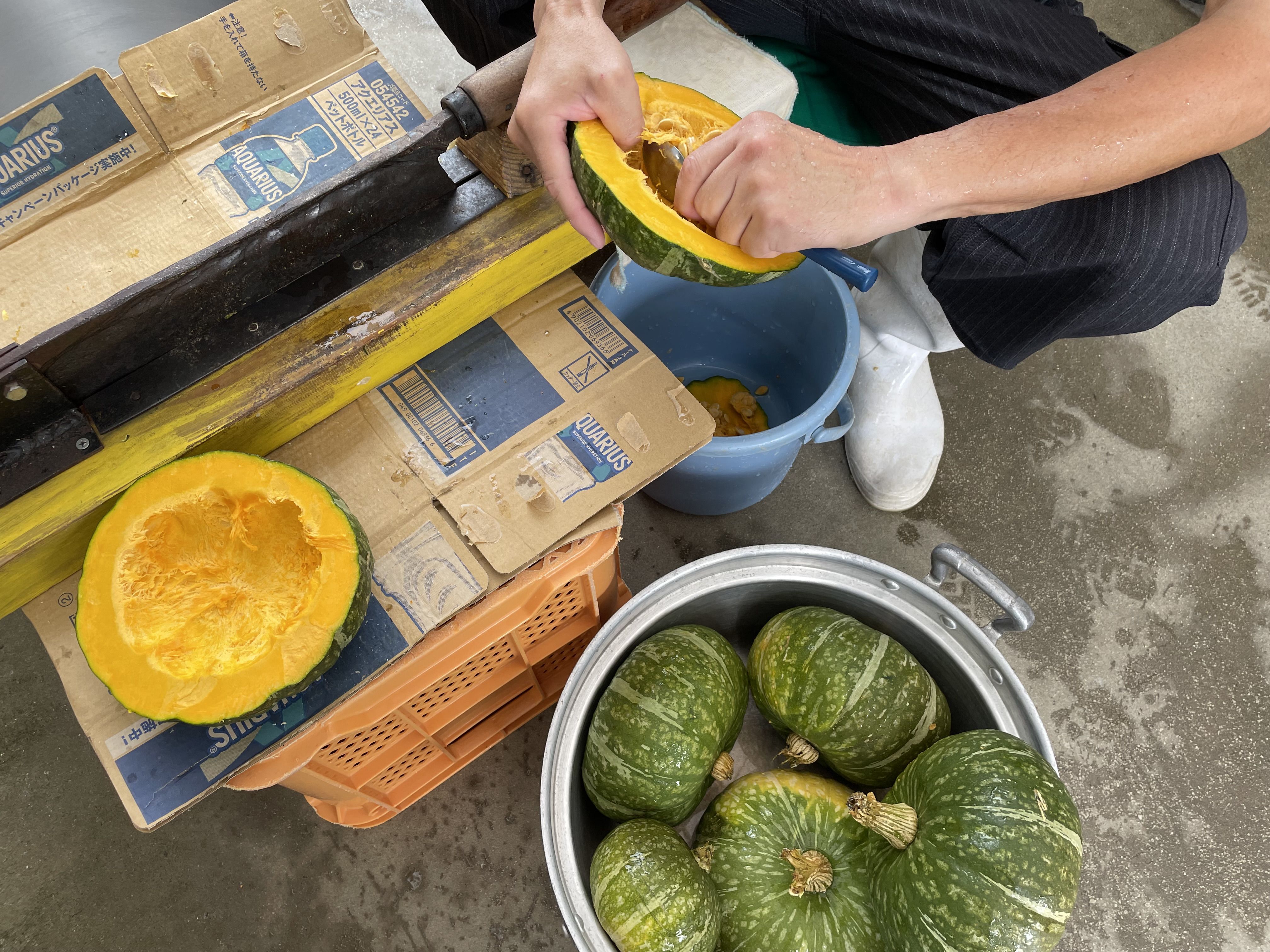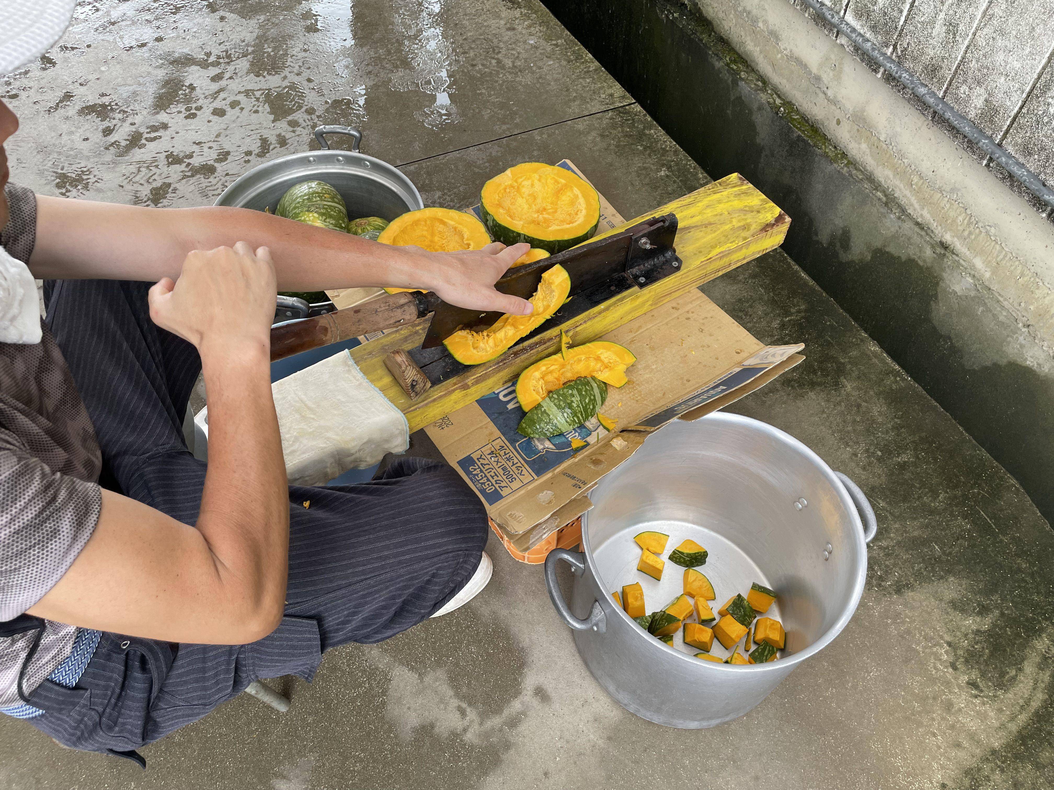 収穫後のカボチャはていねいに処理して、柔らかくなるまでコトコトと煮込んで、ミキサーでペースト状にしてからエサに混ぜます。