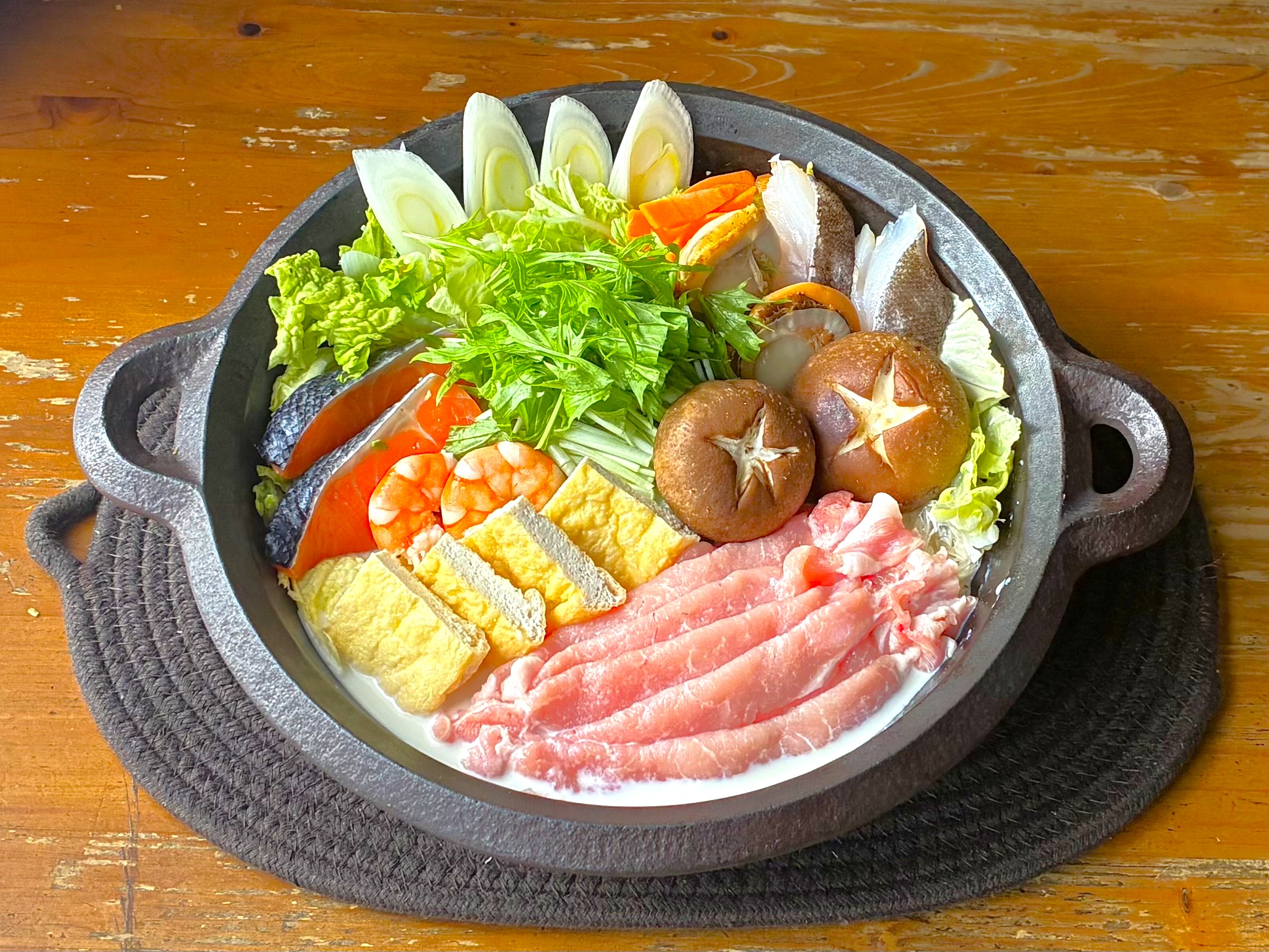 多種多様な食材をいれることで、見た目も栄養も味も満足の鍋に仕上がります◎