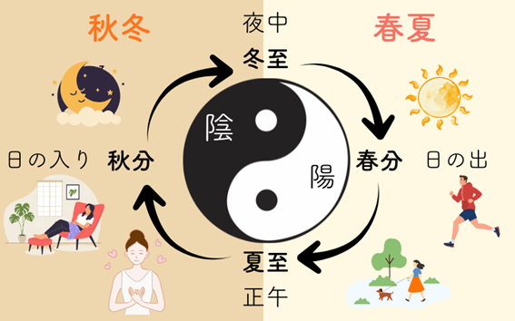 自然界にあるすべてのものが「陰」と「陽」という反対の性質を持つものに分けられると考えられています。1年で見ると春と夏が陽、秋と冬が陰となり、1日で見ると朝と昼が陽、夕方から夜が陰となります。