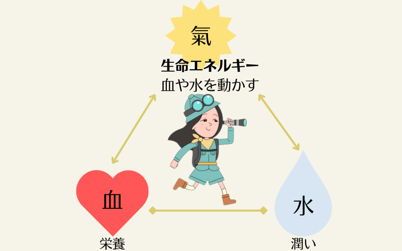 中医学では、人の体は「氣・血・水(津液)」の3つが体を支える要素となり、これらのバランスが健康のカギと考えられています。ぜひ、覚えておいてくださいね!