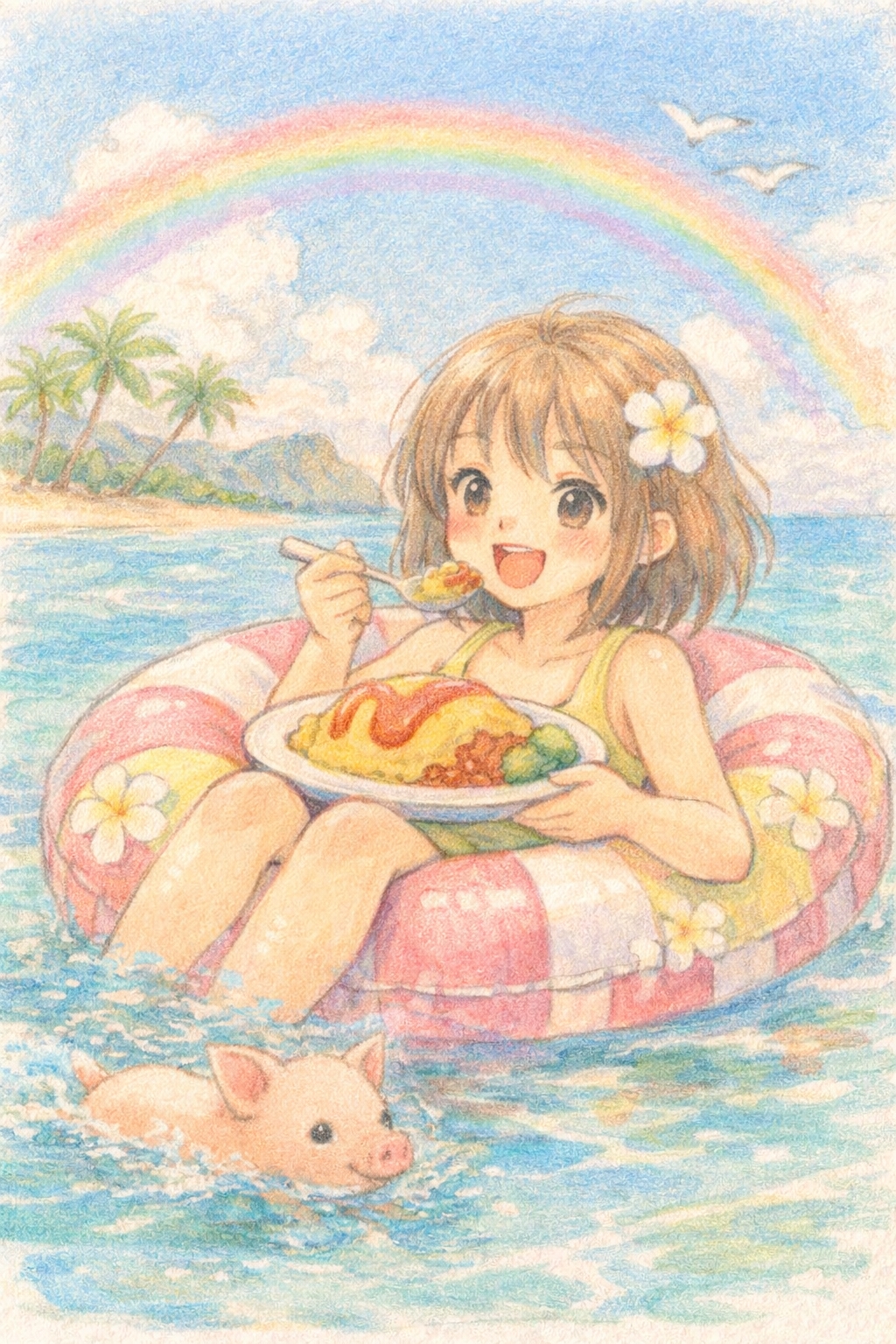 夢で見た風景「ハワイの海で浮き輪に浮かびながらオムライスを食べていると、目の前を小さなブタが泳いで横切って…」と見たままに文字入力すると